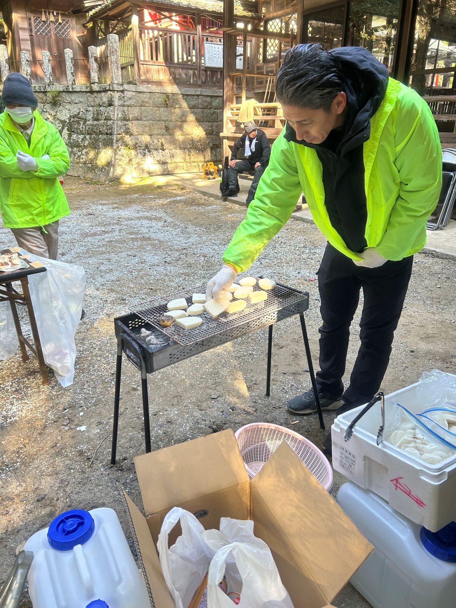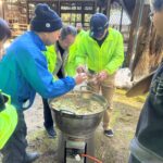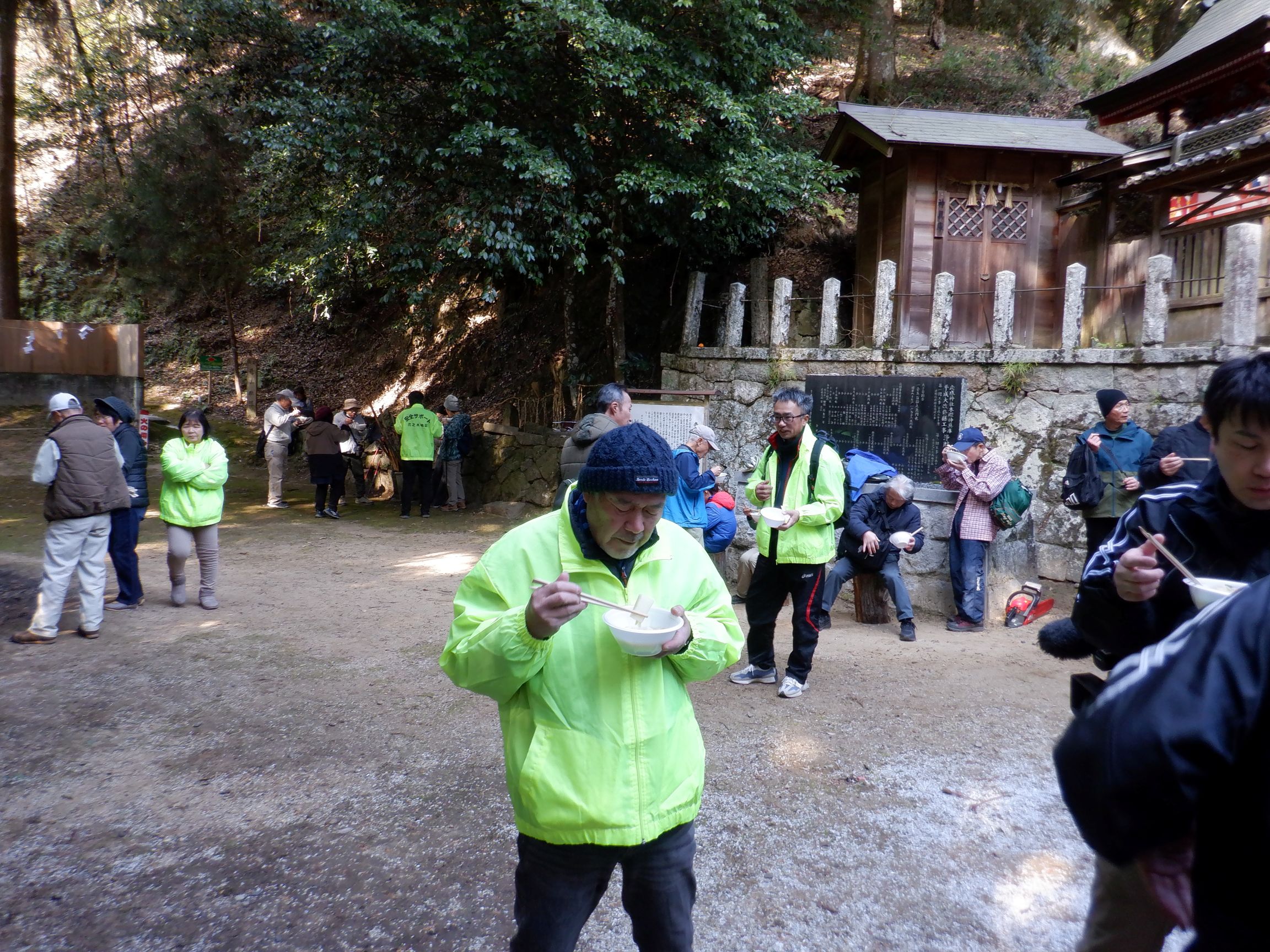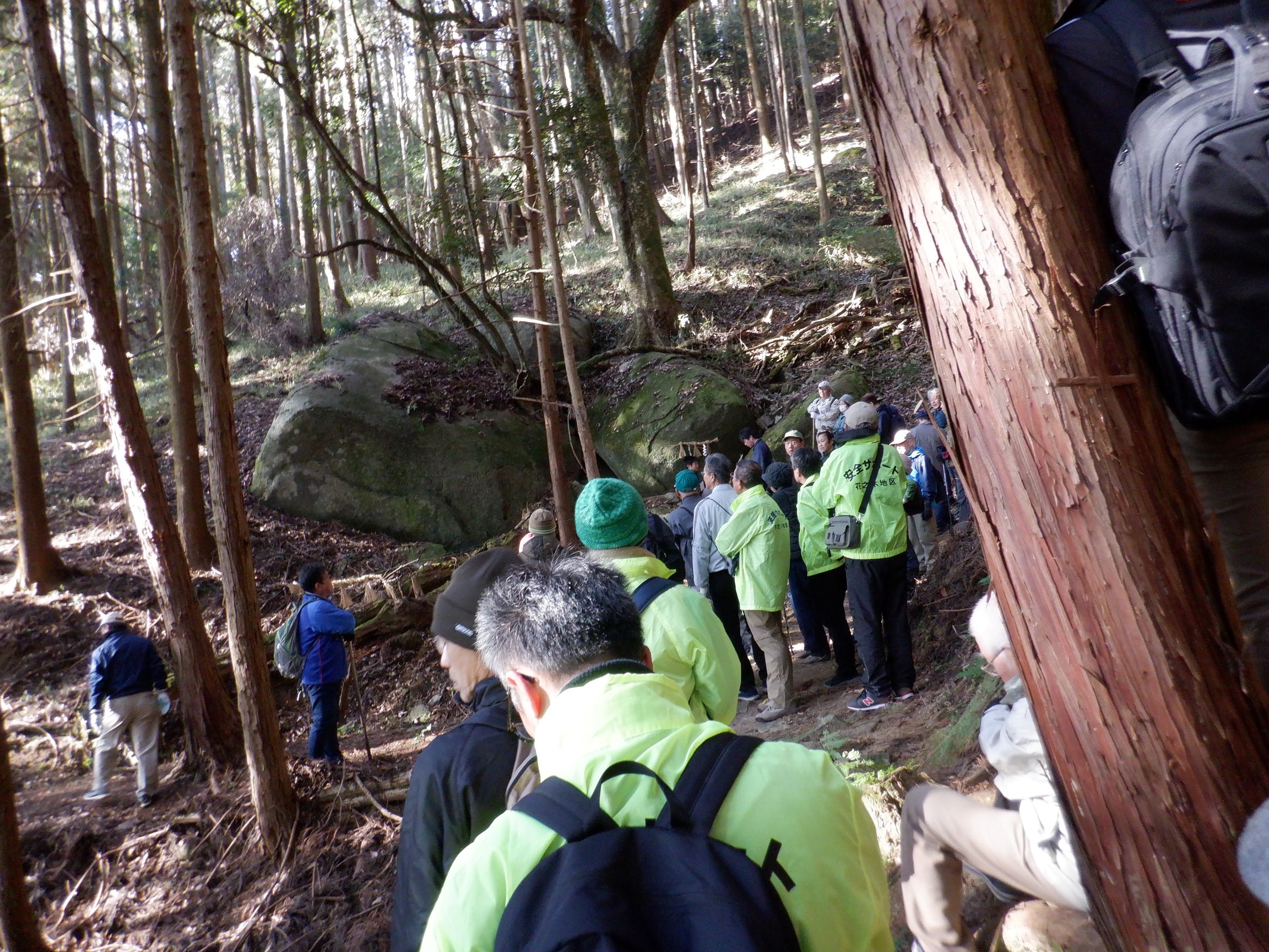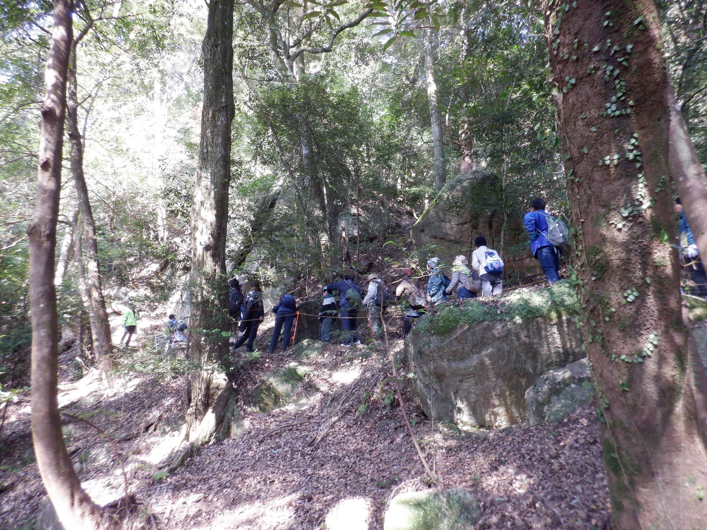 阪神淡路大震災(兵庫県南部地震1995年1月17日発生)の直近の日曜日となる1月18日(日)に「法花断層を見て歩こう会」を実施しました。晴天に恵まれ、地区内外から多くの方がご参加くださり、法花断層崖保存会の稲垣八尺氏の先導で登山道の途中にある巨岩・奇岩の由来にまつわるお話を聞きながら観察し、2ヶ所の展望台からの眺望を楽しみました。下山後は。産業振興・地域交流部会による竜王鍋の振る舞いに舌鼓をうち、来年の開催、ご参加をお約束し無事終了、解散となりました。ご参加いただいた皆様、法花断層崖保存会の皆様、法花地区の皆様、自治協役員、部会員並びに関係者の皆様のご協力により安全に開催、無事終了できましたことに感謝いたします。
